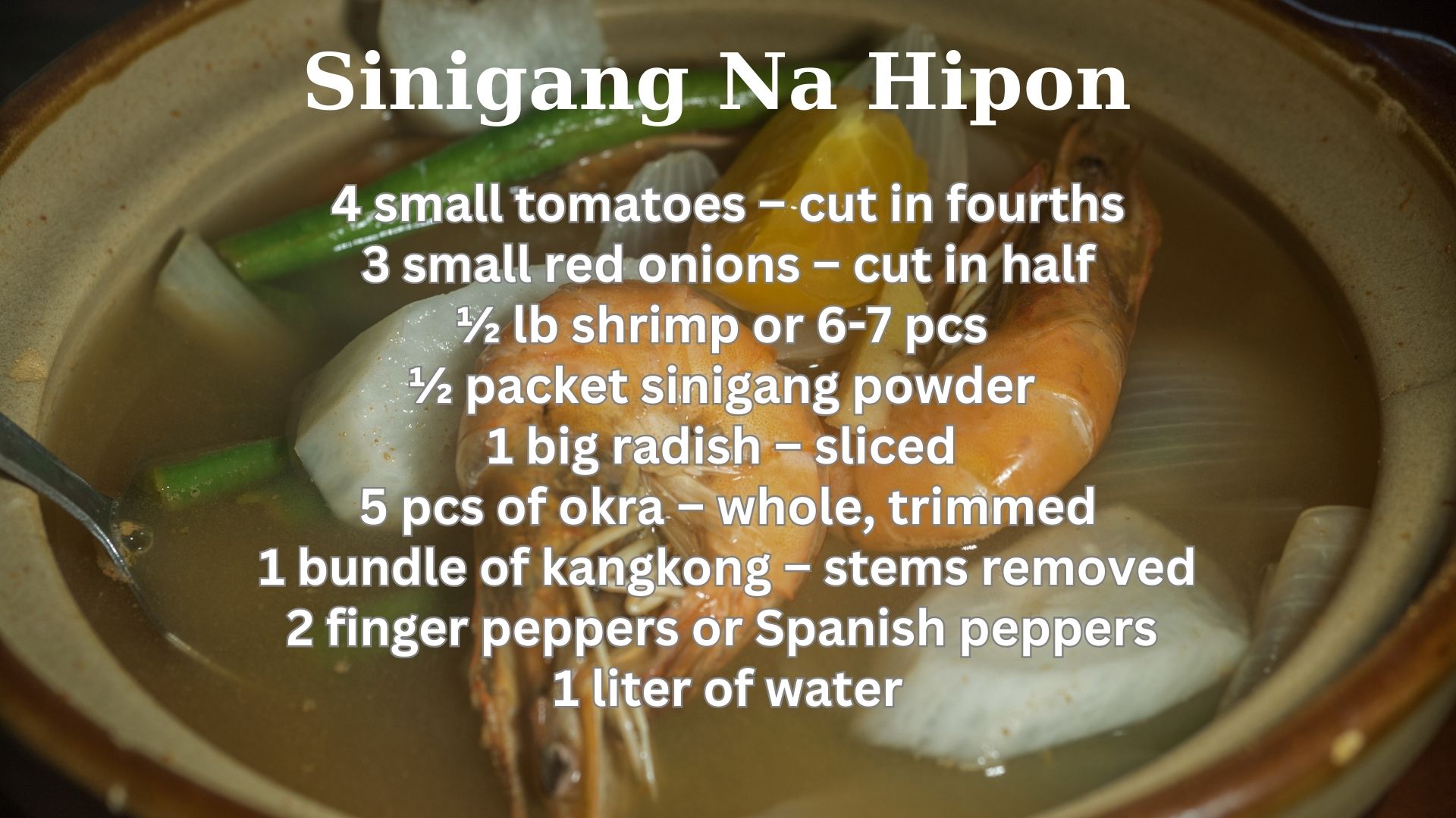 Sinigang is a sour and savory Filipino soup made with meat or seafood (pork, beef, chicken, shrimp, or fish) and flavored with tamarind, tomatoes, onions, and other vegetables you have on hand.