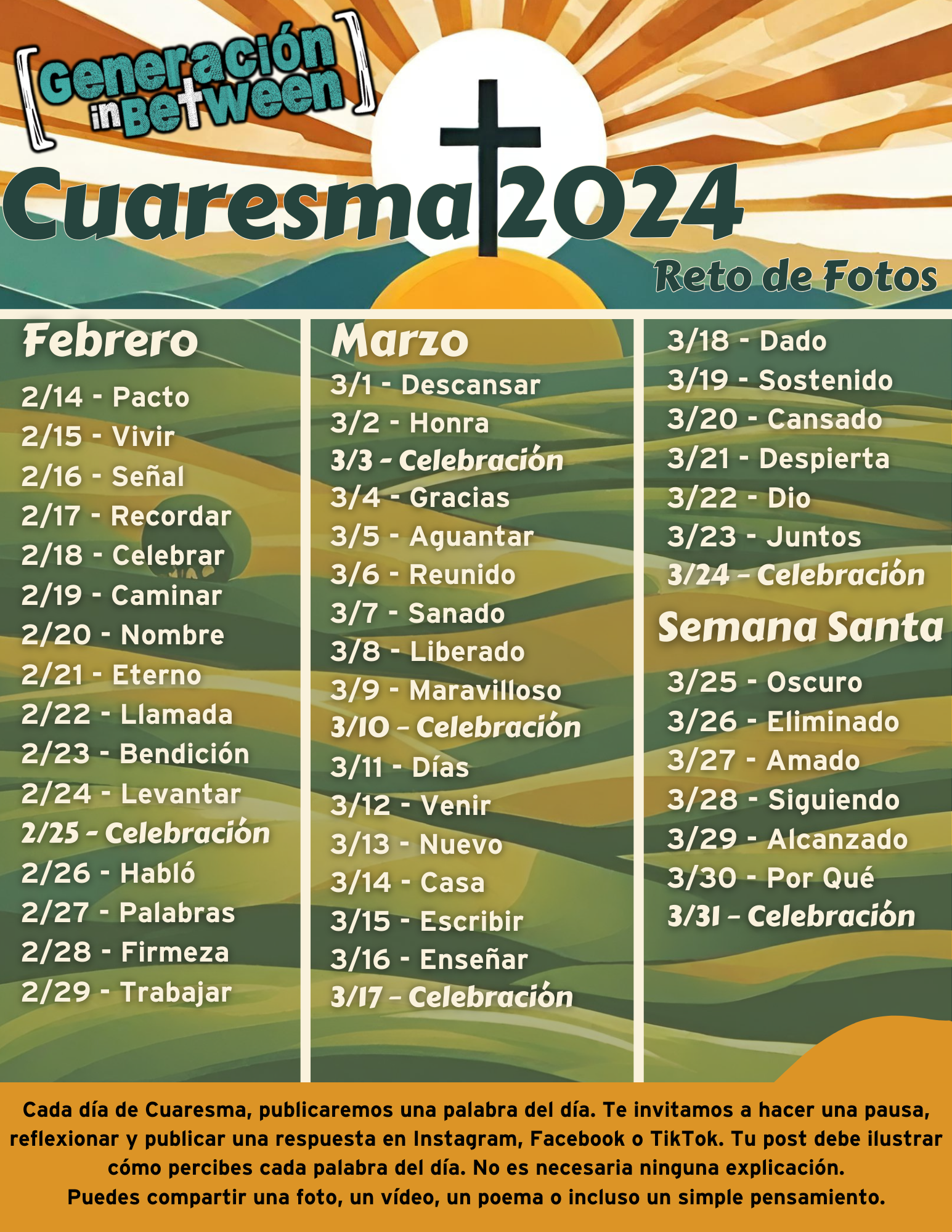 Uno de los devocionales de Cuaresma más populares es nuestro reto Foto al día. Cada día te presentamos una palabra inspirada en las Escrituras. A lo largo del día, observa cómo la palabra te inspira o aparece en tu vida y comparte tus pensamientos publicando una foto. No hace falta que expliques nada. Al fin y al cabo, una imagen vale más que mil palabras. Etiquétanos en tu Instagram, Facebook, o TikTok con #generacioninbetween y #rethinkchurch.