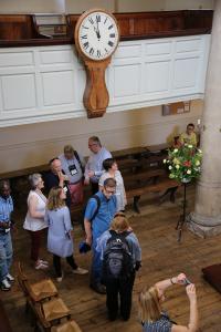 Las bancas en El Nuevo Aposento no son originales, pero el reloj sí. Juan Wesley aconsejó a sus predicadores “Ser puntuales. Hacer todo precisamente a tiempo”. Foto por Kathleen Barry, Comisión Metodista Unida de Comunicaciones.