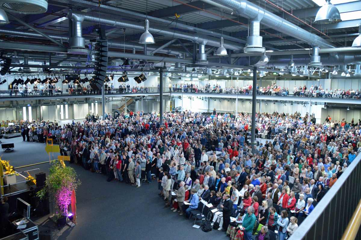 Les services d'ordination sont généralement hébergés par des conférences annuelles autour de leurs rassemblements annuels, comme ce service de la Conférence annuelle d'Allemagne du Sud en 2015. Photo de Klaus Ulrich Ruof, Allemagne.
